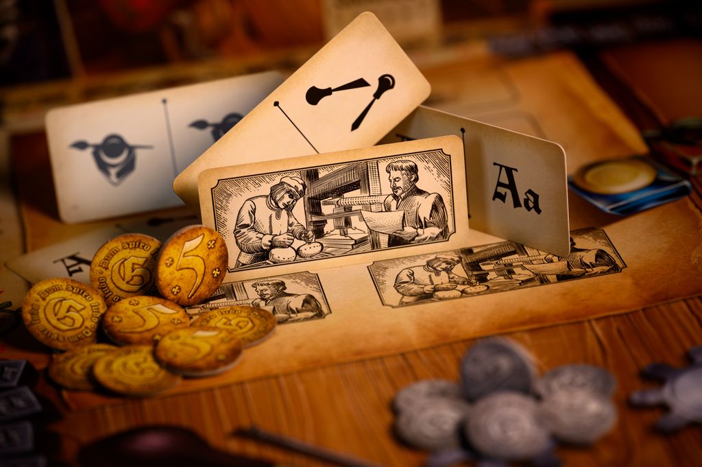 Gutenberg is a board game for 1-4 people in which players will play as the pioneers of printing in the 15th century. By carrying out orders, they will build their wealth and fame. By improving their printing workshops and gaining the support of patrons, they will develop their production capacity. The game will be won by a printer who boasts the greatest recognition and wealth.