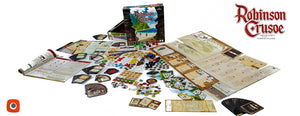 Robinson Crusoe: Adventures on the Cursed Island is a game created by Ignacy Trzewiczek, the author of Stronghold. This time Trzewiczek takes the players to a deserted island, where they'll play the parts of shipwreck survivors confronted by an extraordinary adventure. They'll be faced with the challenges of building a shelter, finding food, fighting wild beasts, and protecting themselves from weather changes. Building walls around their homes, animal domestication, constructing weapons and tools from what they find and much more awaits them on the island. The players decide in which direction the game will unfold and – after several in-game weeks of hard work – how their settlement will look. Will they manage to discover the secret of the island in the meantime? Will they find a pirate treasure, or an abandoned village? Will they discover an underground city or a cursed temple at the bottom of a volcano? Answers to these questions lie in hundreds of event cards and hundreds of object and structure cards that can be used during the game...